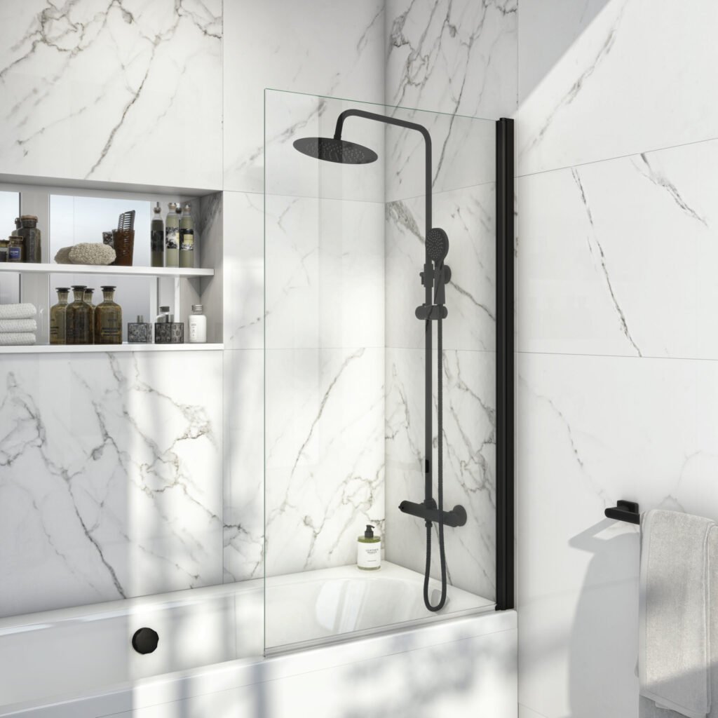 Matt Black 900mm Pivot Bath Screen Including Fixed Panel