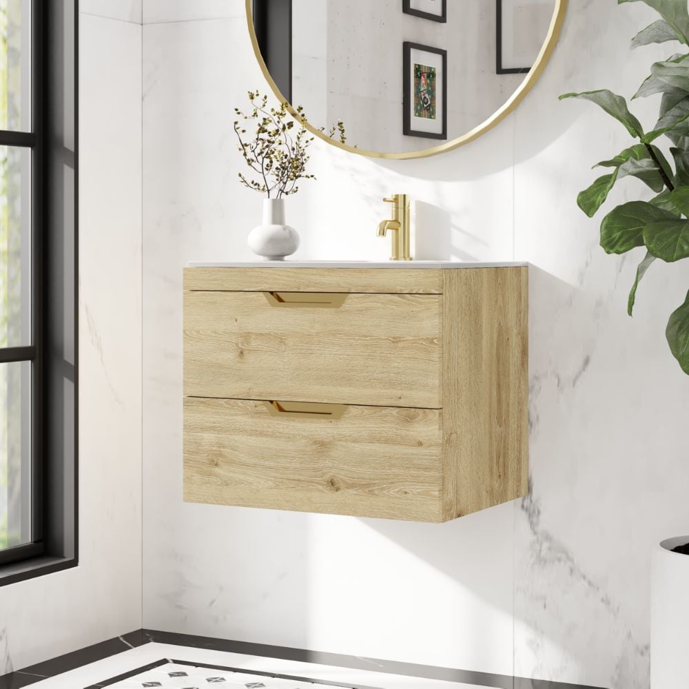 Aubrey 600 mm Davos Oak Wall-Hung Vanity Unit with Basin – Optional Handle Colours
