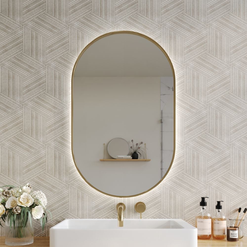 Aubrey Brushed Brass LED Bathroom Mirror with Demister – Oval 500 × 800 mm