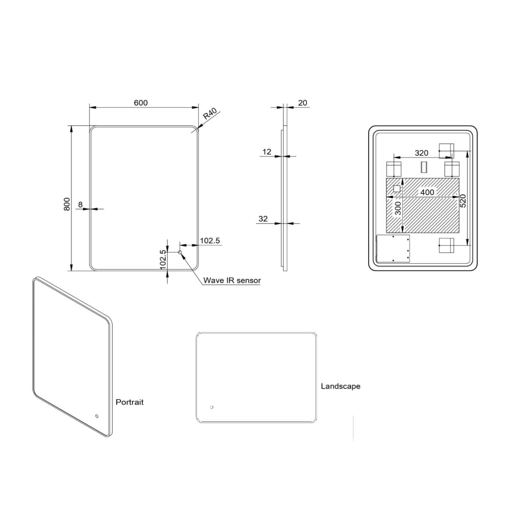 Mono Black LED Soft Square Bathroom Mirror W/Demister and Colour Change Lighting 500X700mm