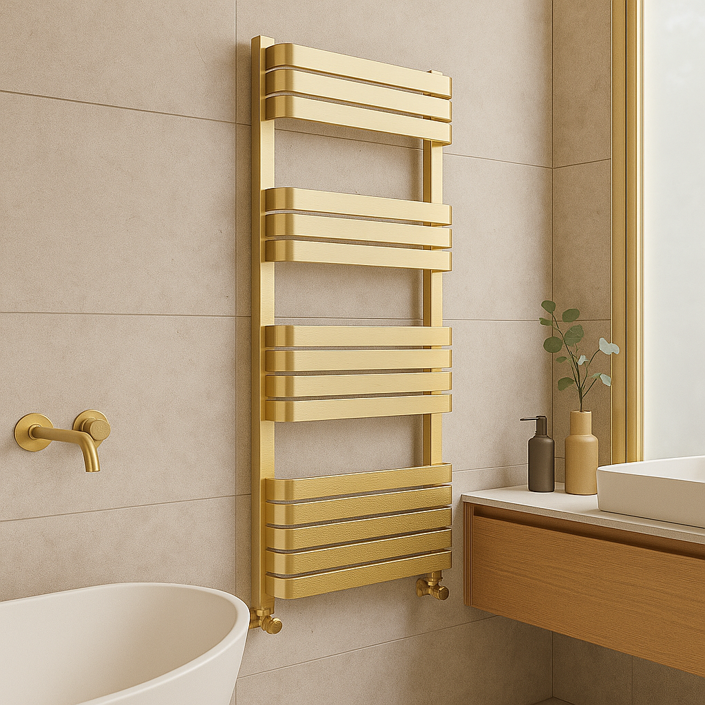 Our Designer Towel Radiators range where we offer the perfect blend of luxury and functionality in the most stylish way. Our exclusive collection of heated towel rails is designed to make a statement of taste and luxury bathroom style. We are confident that you will find the perfect heated towel rail that not only keeps your towels toasty but also adds a touch of elegance to your bathroom. Our range includes stunning gloss and matte finishes, catering to diverse aesthetic preferences. Our brushed brass and chrome finishes offer a sleek and contemporary look and are designed for durability and long-lasting beauty. With our Designer Towel Radiators, you can be sure to enjoy a luxurious and stylish bathroom experience.