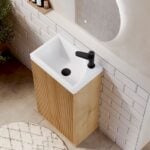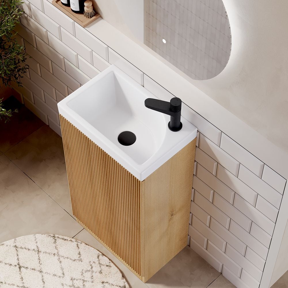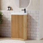 Upgrade your cloakroom with the Flauto Mini 460mm fluted country oak vanity unit & basin, designed for compact spaces.