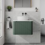 Upgrade your bathroom with the stylish Scudo Linea Curve 600mm Reed Green Wall‑Mounted Vanity Unit, marrying compact convenience with luxurious design. The standout reed green curved fluted front features an integrated recessed handle, offering textured elegance and contemporary appeal.