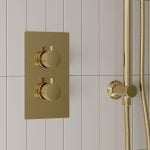 In conclusion, the Scudo Core Brushed Brass Concealed Shower Set With Ceiling Mounted Head & Riser Rail perfectly blends style, quality, and functionality, making it an ideal fit for your bathroom. With its durable construction, multiple shower options, and anti-scald protection feature, you can enjoy a luxurious and safe shower experience every time.