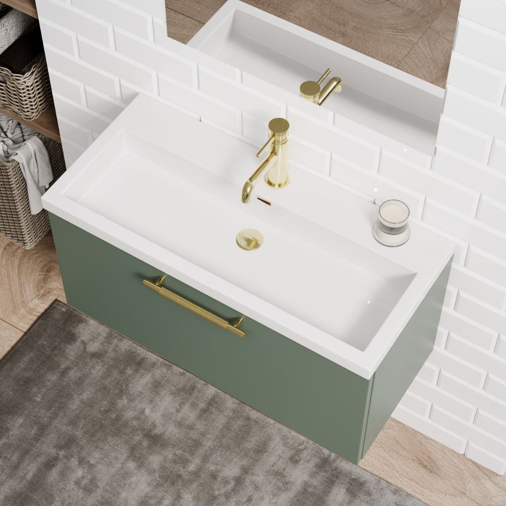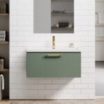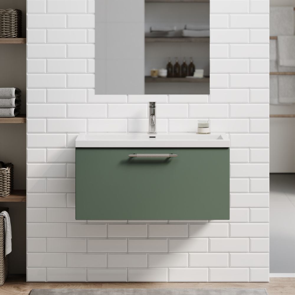 Add a statement of modern design and space-saving practicality to your bathroom with the Blake 800mm 1-Drawer Reed Green Wall-Hung Vanity Unit & Basin. This vanity delivers a perfect balance of style and functionality, with a sleek floating design that enhances both small and large bathrooms.