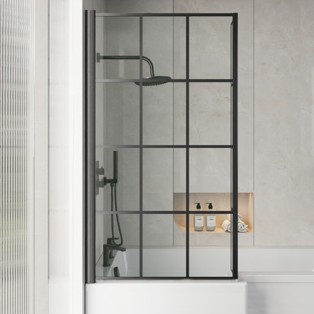 Included in the package is a striking matt black grid bath screen, constructed from 6mm toughened safety glass with a durable aluminium frame. The grid design adds a modern industrial touch, creating a strong visual feature while helping to contain water spray during showers.