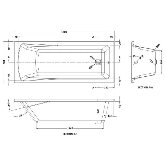 Nuie Linton Single Ended Square Bath – 1700 x 700mm