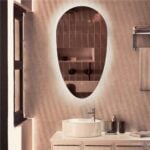 Its frameless design and unique teardrop shape create a clean, modern aesthetic that stands out from traditional mirror styles, making it perfect for contemporary bathrooms, en-suites, and cloakrooms.