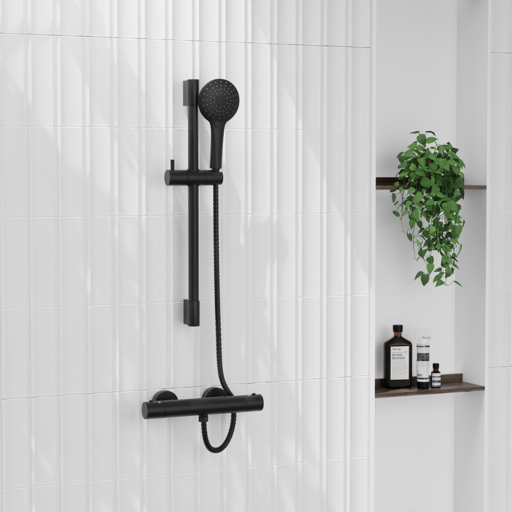 The Orca Matt Black Shower Riser Rail Kit with 3-Mode Multifunction Shower Head combines stylish design with dependable shower performance. Featuring a bold matt black finish, this riser rail kit brings a contemporary edge to modern bathrooms while offering practical versatility.