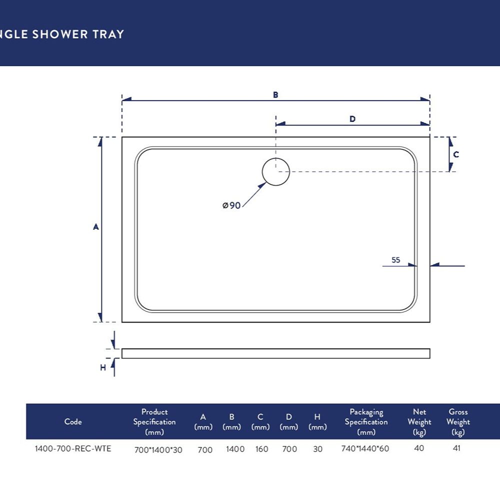 The 1400 x 700mm rectangular size is perfect for narrower bathroom layouts, offering extended length for a comfortable showering experience while maintaining a compact width to suit tight spaces.