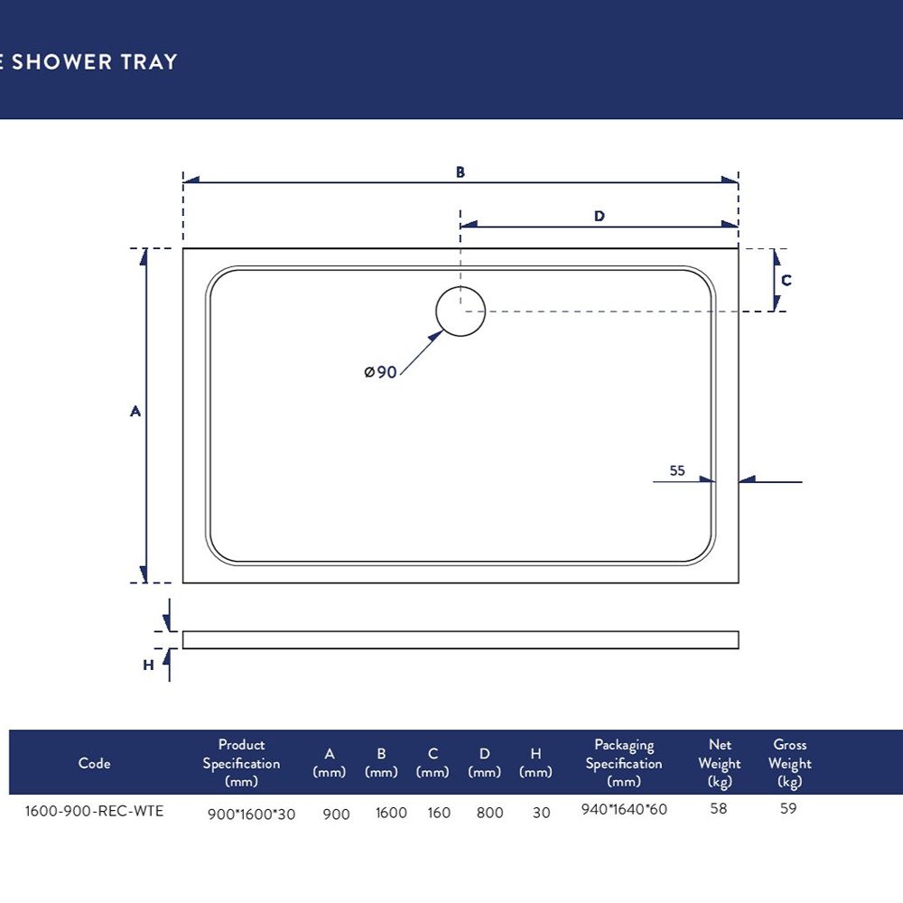 The 1600 x 900mm rectangular size offers a generous and comfortable showering area, making it perfect for walk-in enclosures, large sliding doors and premium bathroom layouts.