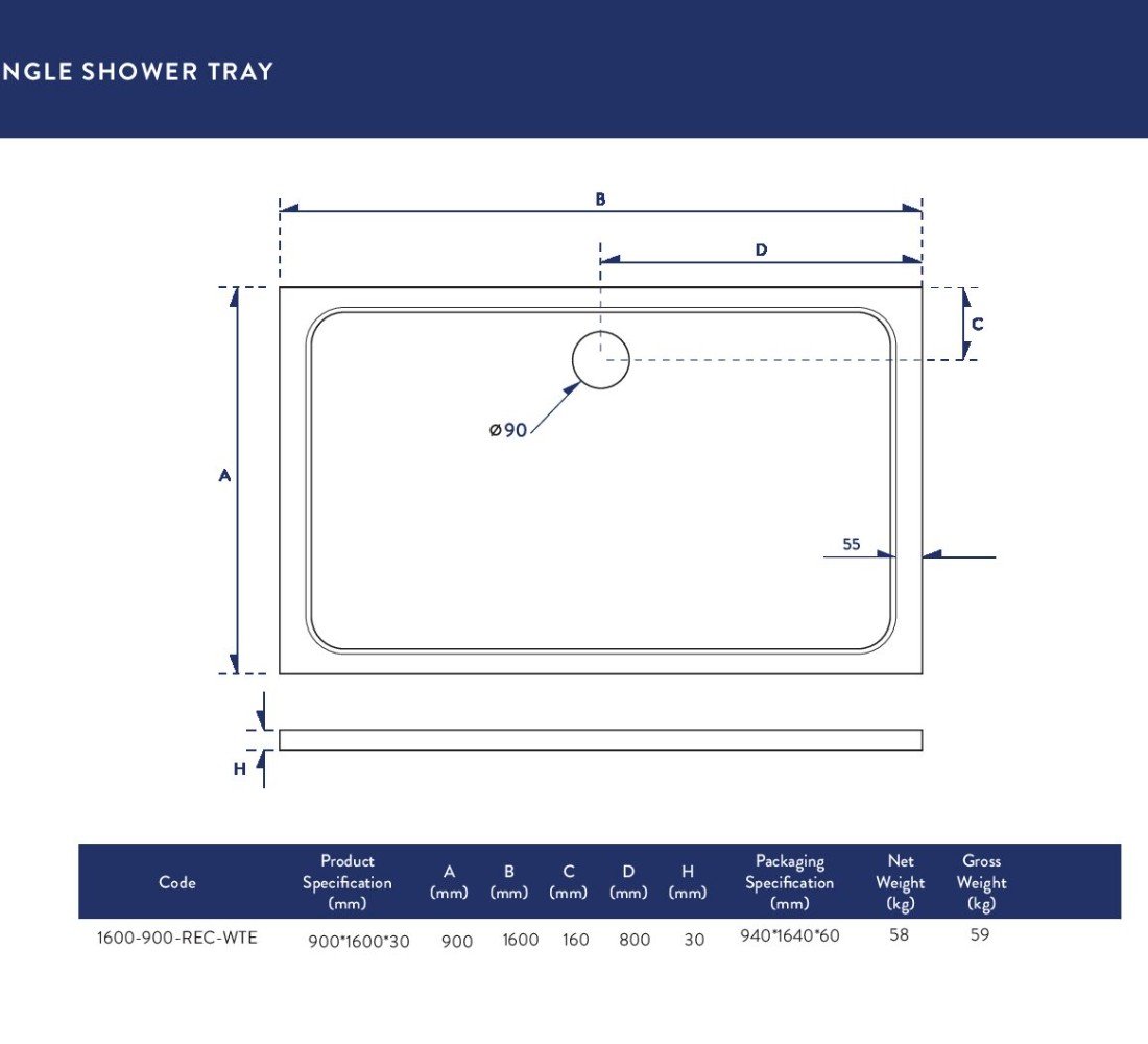 1600 x 900 mm Rectangular Shape — spacious footprint ideal for larger showers
