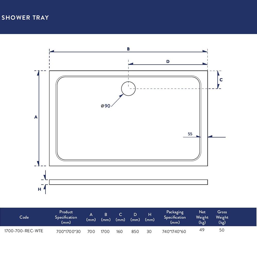 The 1700 x 700mm rectangular size is perfect for narrow bathroom layouts, offering extended length for a more comfortable showering experience while maintaining a compact width for space-saving installations.