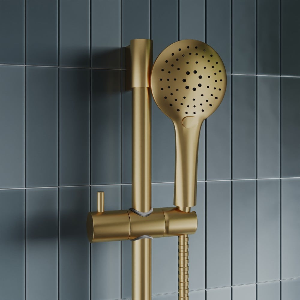 **Exposed Bar Valve:** This valve allows you to easily control the water temperature and flow. Its brushed brass finish adds elegance to your bathroom.