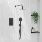 Tailored Matte Black Round Thermostatic 2 Outlet Concealed Shower perfectly blends style and functionality. This shower’s sleek square design will add a modern touch to any bathroom decor. The matte black finish gives it a sophisticated and contemporary look, making it a standout feature in your bathroom. This concealed shower is not only aesthetically pleasing but also highly practical. The thermostatic control ensures a consistent water temperature, providing a comfortable and enjoyable showering experience. With two outlets, you can easily switch between different shower functions, whether a relaxing rainfall shower or a powerful handheld spray. We take pride in the quality of our products, which is why this concealed shower comes with a 10-year guarantee. You can have peace of mind knowing that it is built to last and withstand the test of time. Upgrade your bathroom with our Tailored Matte Black Round Concealed Thermostatic 2 Outlet Concealed Shower and enjoy the perfect combination of style, functionality, and durability.