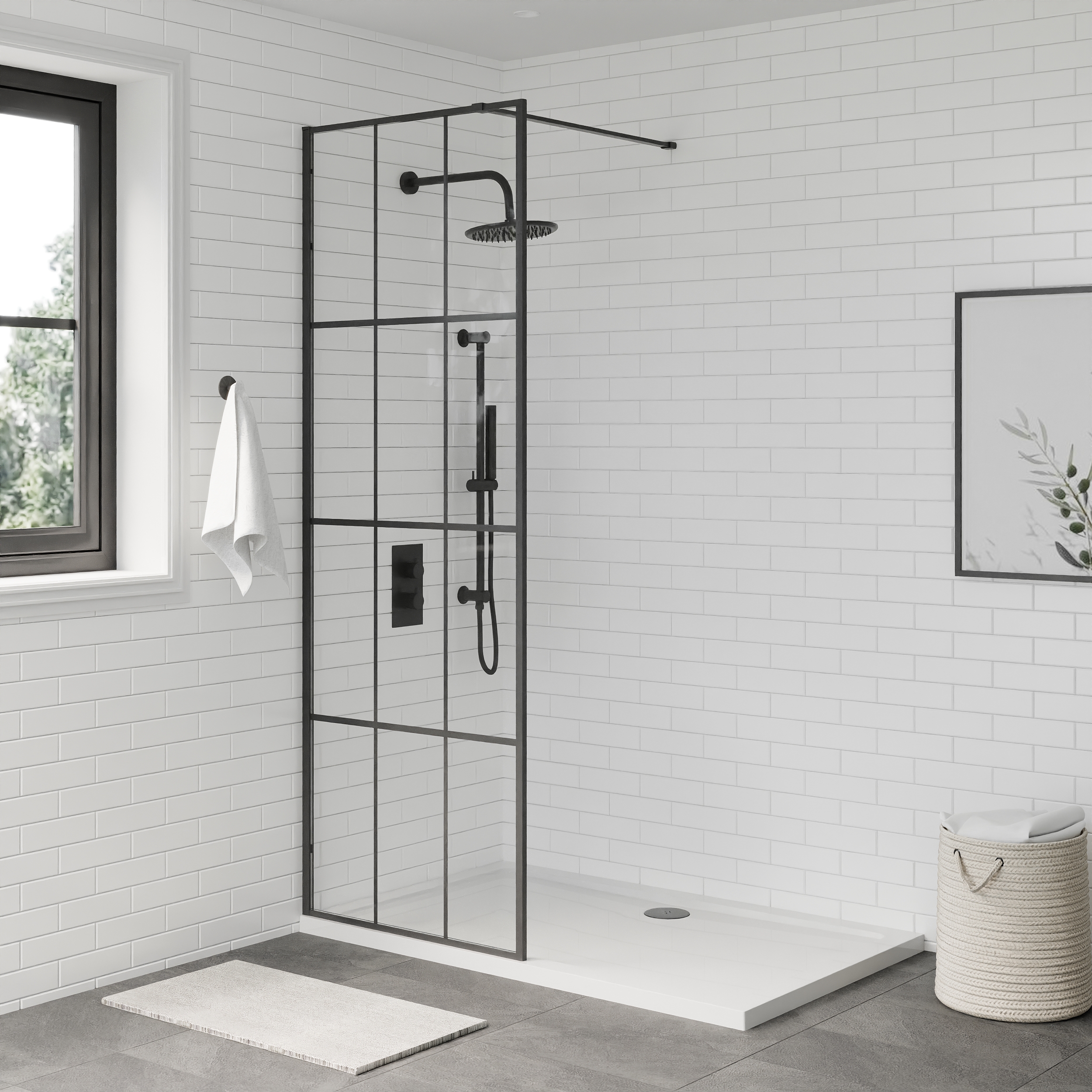 Crafted from 8mm toughened safety glass, this wetroom panel offers strength and stability while maintaining a sleek, open-plan feel. The distinctive black grid frame creates a bold, industrial aesthetic that works perfectly with contemporary décor, matte black fittings, and contrast finishes.